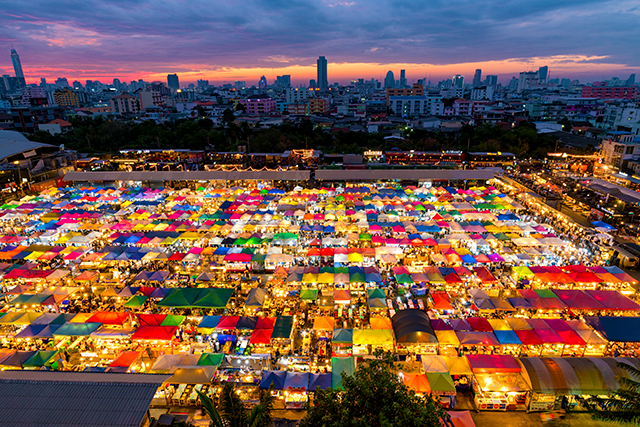 ワット・パークナム最上階プッタクナーロム室まで上がるとアートのような仏陀の生涯図(仏伝図)の天井画が目に飛び込んできます。天国を象徴するフロアとも言われ映えスポットです。ラチャダー鉄道市場(ナイトマーケット。カラフルな屋台の屋根がぎっしり並び、キラキラ光り輝く宝石の海のよう。人気の映えスポットです。夕刻は大渋滞がありますので地下鉄で行くのがお勧め。もう一つはマハナコーンビル最上階78階にあるスカイウォーク360度のパノラマビューは圧巻です。必見